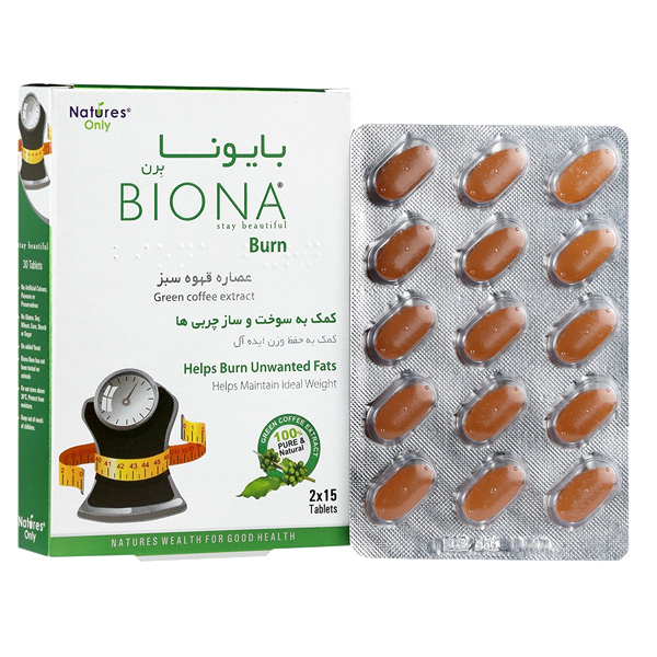 قرص بایونا برن نیچرز اونلی یک فرآورده کاملا طبیعی حاوی دوز مناسبی از 400 میلی گرم پودر عصاره دانه قهوه سبز استاندارد شده است که مصرف آن میتواند در کاهش وزن، تنظیم فشار خون، حفظ سلامت قلب و عروق و تقویت سیستم ایمنی موثر باشد. بایونا برن از دانههای قهوه سبز خام و بدون بو تهیه شده است که حاوی مقدار بالایی از کلروژنیک اسید و پلی فنلها است. این محصول تحت لیسانس بایوپلاس هند و در بستههای 30 عددی عرضه شده است.