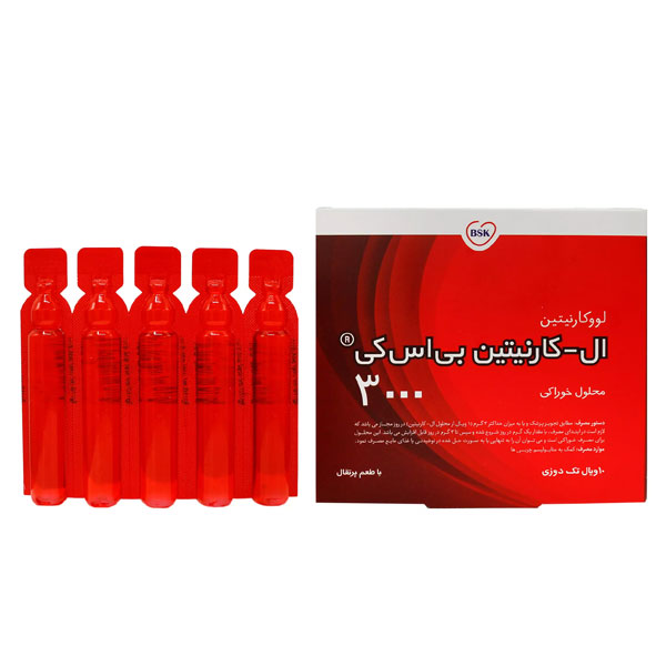 هر ویال ال کارنیتین ۳۰۰۰ بی اس کی (BSK) با وزن ۱۰ میلیلیتر است. یعنی در هر ویال ۳۰۰ میلیگرم ال کارنیتین بوده که برای مصرف خوراکی است و میتوان آنرا به تنهایی یا به صورت حل شده در نوشیدنی یا غذای مایع مصرف نمود. ال کارنیتین موجب افزایش سطح انرژی بدن، بهبود عملکرد قلب، عروق و کبد، بهبود خستگی جسمی و روحی و افزایش توده ماهیچهای میشود. اسیدهای آمینه لیزین و متیونین که در ال کارنیتین وجود دارند با آزاد کردن انرژی داخل چربی آن را به انرژی تبدیل میکنند. در واقع اسیدهای چرب را به داخل یک اندامک به اسم میتوکندری برده و در انجا عمل سوخت و ساز صورت میگیرد.